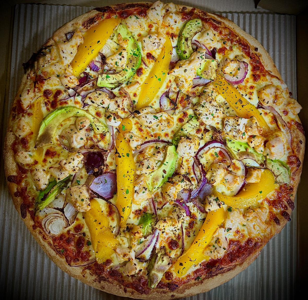 Butter Chicken PizzaSpanish onion,marinated chicken breas,fresh tomato, fire roasted capsicum,mozarella topped with homemade indian butter sauce×