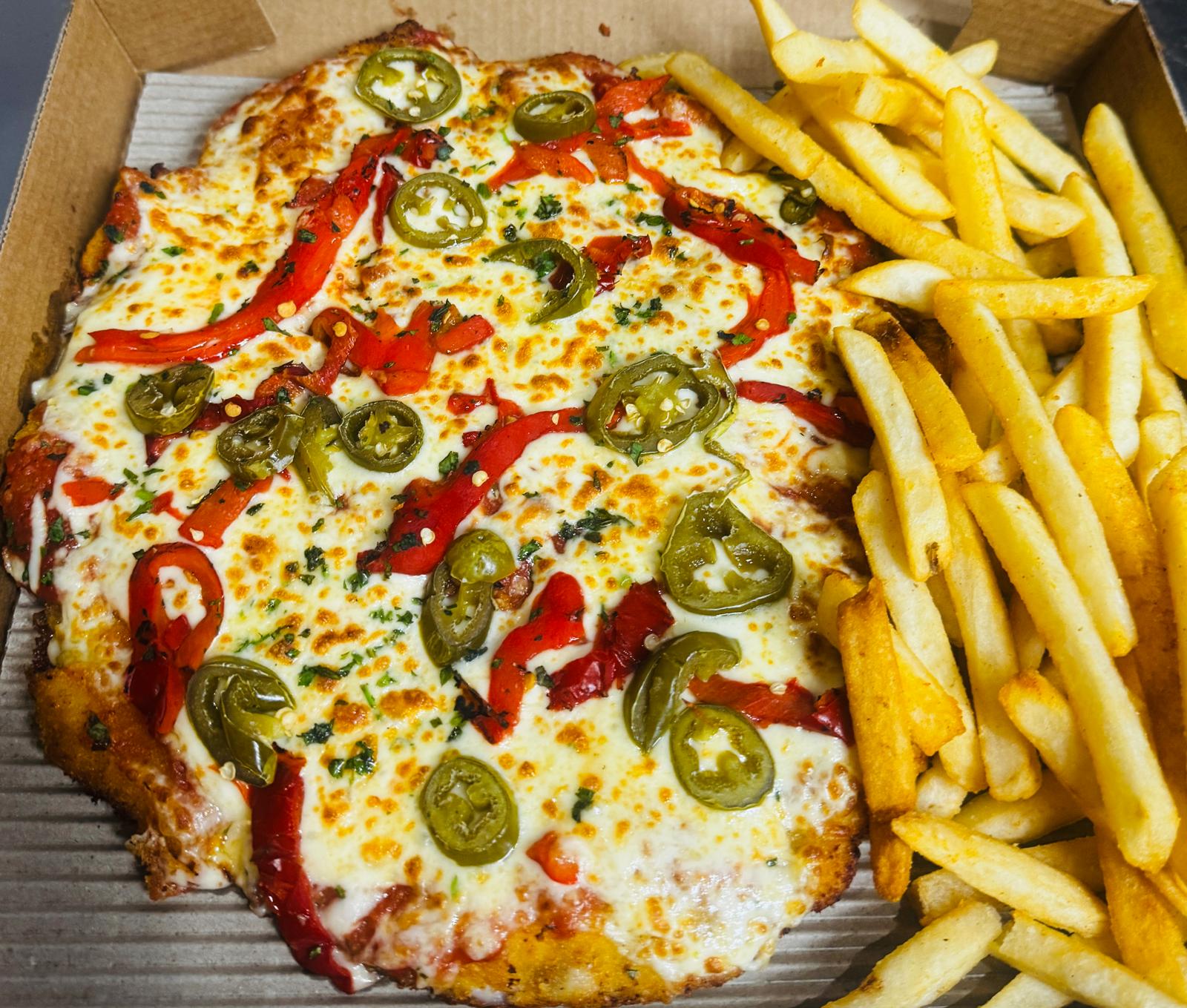 Butter Chicken PizzaSpanish onion,marinated chicken breas,fresh tomato, fire roasted capsicum,mozarella topped with homemade indian butter sauce×