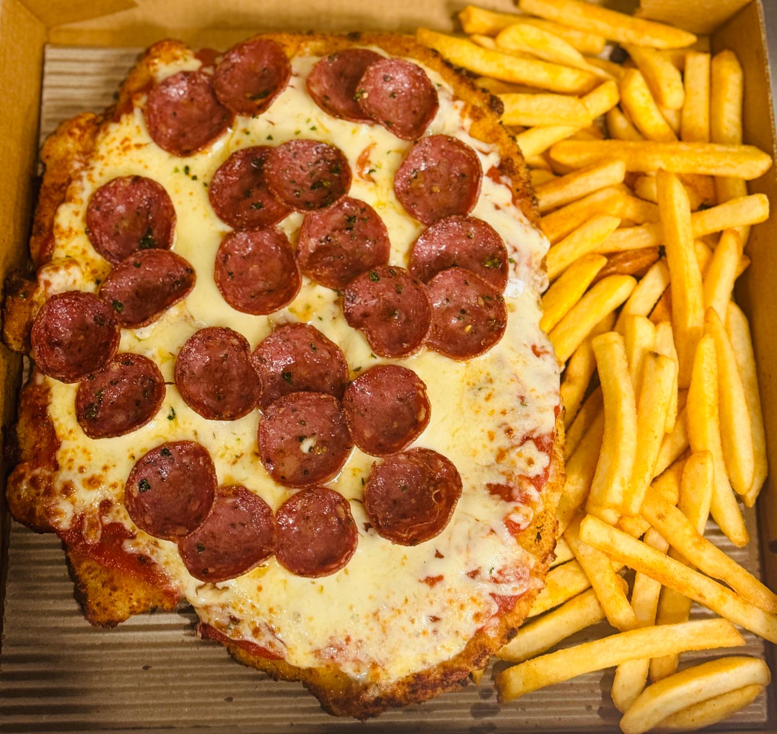 Chicken Parmigiana BurgerChicken schnitzel with pizza sauce, cheese, bacon lettuce and BBQ sauce×